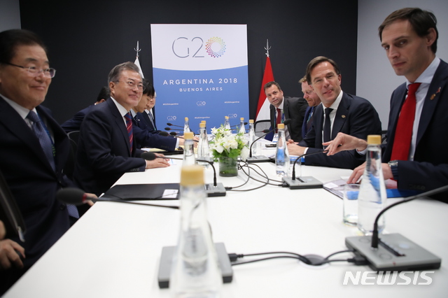 【부에노스아이레스(아르헨티나)=뉴시스】전신 기자 = 문재인 대통령이 1일(현지시간) 부에노스아이레스 코스타 살게로 센터 G20 양자회담장에서 마르크 뤼터 네덜란드 총리와 정상회담을 하고 있다. 2018.12.02.