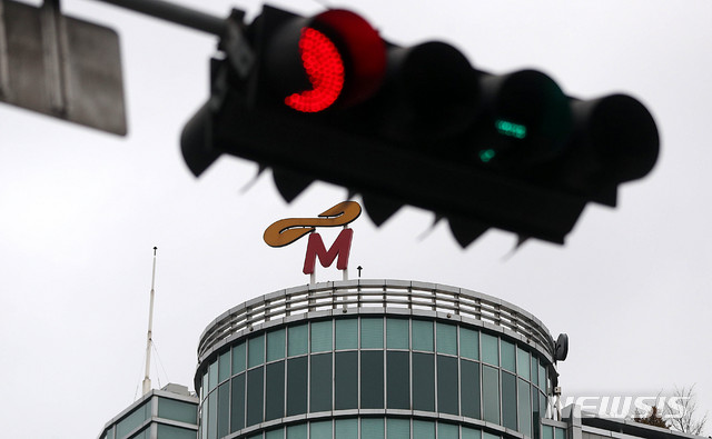 【서울=뉴시스】추상철 기자 = '갑질논란'을 빚은 피자 프랜차이즈 '미스터피자'를 운영하는 MP그룹이 실적 악화 등으로 상장폐지 수순을 밟게 됐다. 4일 오후 서울 서초구 MP그룹 본사 앞 신호등에는 빨간불이 켜져 있다. 2018.12.04.