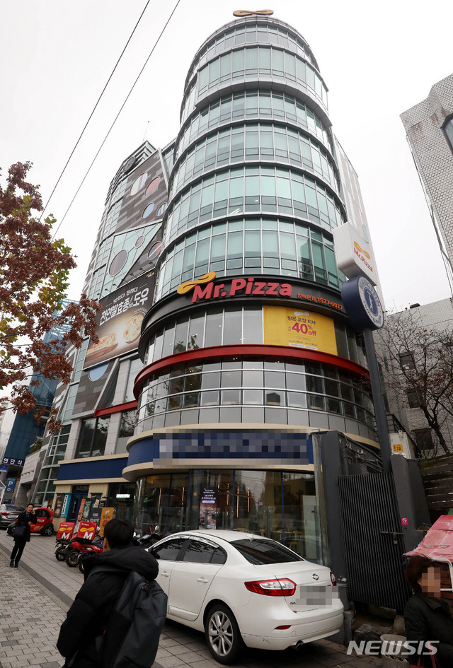 【서울=뉴시스】추상철 기자 = '갑질논란'을 빚은 피자 프랜차이즈 '미스터피자'를 운영하는 MP그룹이 실적 악화 등으로 상장폐지 수순을 밟게 됐다. 4일 오후 서울 서초구 MP그룹 본사에서 미스터피자 로고가 보이고 있다. 2018.12.04.