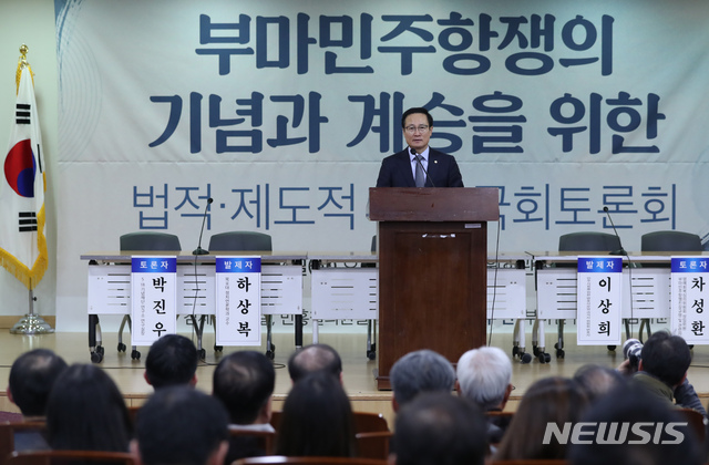 【서울=뉴시스】고승민 기자 = 더불어민주당 홍영표 원내대표가 4일 오후 서울 여의도 국회 의원회관에서 열린 '부마민주항쟁의 기념과 계승을 위한 법적, 제도적 과제 국회토론회'에서 축사를 하고 있다. 2018.12.04.
