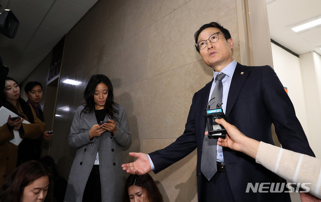 【서울=뉴시스】이종철 기자  = 민주당 홍영표 원내대표가 4일 오후 서울 여의도 국회 운영위원장실 앞에서  ‘영수증 이중제출’ 의혹에 대한 기자들의 질문에 손시레를 치면서  '문제없다'라고 말하고 있다. 2018.12.04.