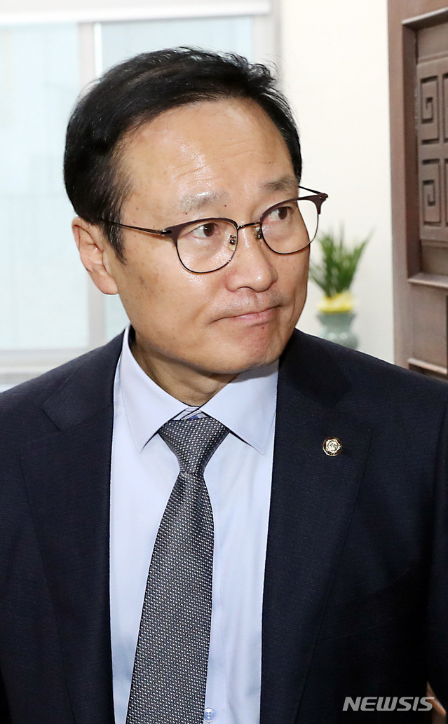 【서울=뉴시스】이종철 기자  = 4일 오후 서울 여의도 국회 운영위원장실에서 열리는 3당 원내대표 회동에 참석하는 민주당 홍영표 원내대표가 심각한 표정을 하고 있다. 2018.12.04.
