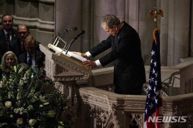 【워싱턴D.C.=AP/뉴시스】5일(현지시간) 미국 워싱턴D.C. 국립대성당에서 거행된 조지 H.W. 부시 전 미 대통령의 장례식에서 장남인 조지 W.부시 전 대통령이 고인이 된 아버지를 기리며 추모 연설을 하던 중 눈물을 보이지 않으려 입을 굳게 다물고 잠시 말을 잇지 못하는 모습. 2018.12.06.