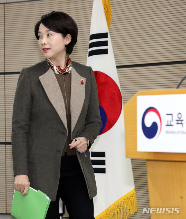 【세종=뉴시스】강종민 기자 = 유은혜 부총리 겸 교육부 장관이 6일 오전 정부세종청사에서 유아교육의 공공성 강화를 위한 '19년 내 전국 1000학급 이상 국·공립유치원 학급을 신·증설하는 세부 이행계획과 학부모 요구를 반영한 서비스 개선 방안 발표를 위해 연단으로 향하던 중 뒤돌아 보고 있다. 2018.12.06.