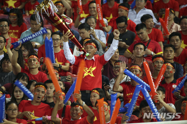 【하노이=AP/뉴시스】6일(현지시간) 하노이 미딘 국립 경기장에서 아세안축구연맹(AFF) 스즈키컵 준결승 베트남과 필리핀의 2차전 홈 경기가 열려 베트남 축구 팬들이 열띤 응원을 펼치고 있다.