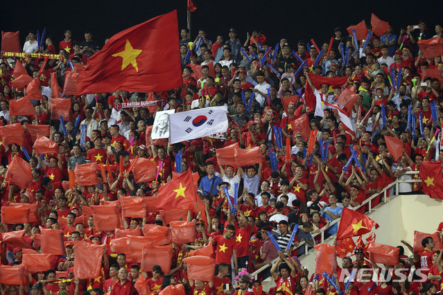 【하노이=AP/뉴시스】6일(현지시간) 하노이 미딘 국립 경기장에서 아세안축구연맹(AFF) 스즈키컵 준결승 베트남과 필리핀의 2차전 홈 경기가 열려 베트남 축구 팬들이 열띤 응원을 펼치고 있다.