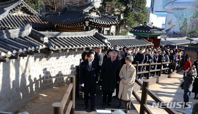 【서울=뉴시스】고범준 기자 = 7일 오전 서울 중구 대한성공회 뒷마당에서 열린 덕수궁 돌담길 연결기념 행사에서 박원순 서울시장, 정재숙 문화재청장, 사이먼 스미스 주한영국대사 등 참석 내빈들이 새 단장한 돌담길을 걷고 있다.
