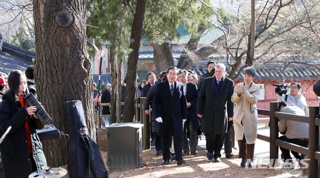 【서울=뉴시스】고범준 기자 = 7일 오전 서울 중구 대한성공회 뒷마당에서 열린 덕수궁 돌담길 연결기념 행사에서 박원순 서울시장, 정재숙 문화재청장, 사이먼 스미스 주한영국대사 등 참석 내빈들이 새 단장한 돌담길을 걷고 있다.