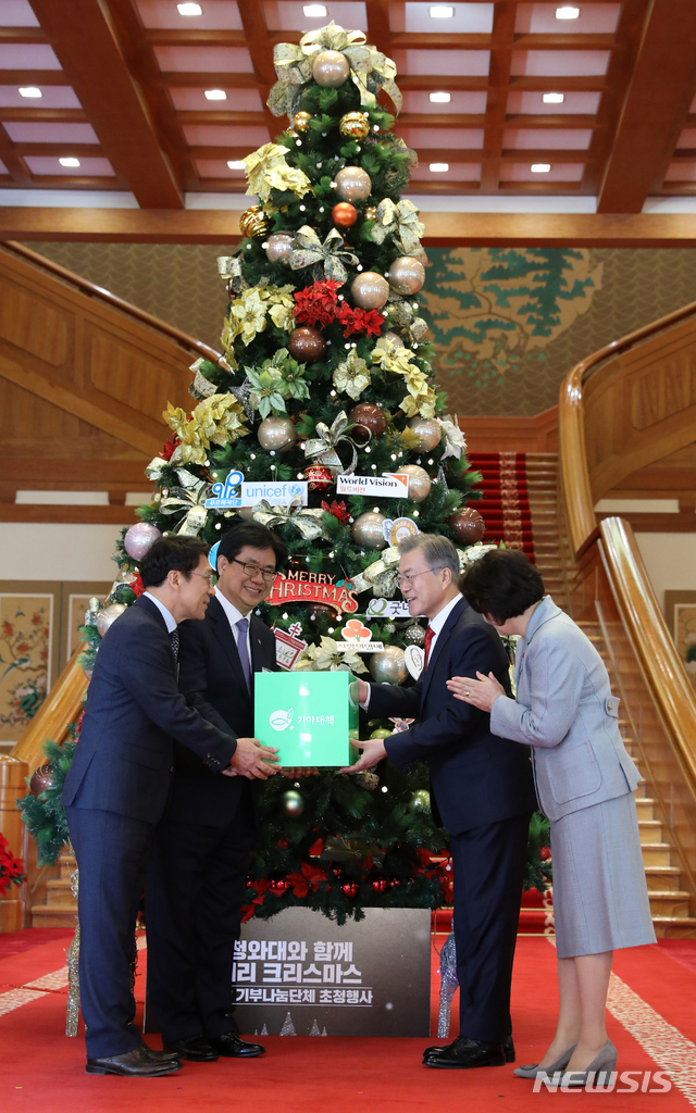 【서울=뉴시스】전신 기자 = 문재인 대통령과 부인 김정숙 여사가 7일 청와대 본관에서 열린 연말 기부나눔단체 초청행사 '청와대와 함께 메리 크리스마스'에서 한국국제기아대책기구에 성금을 기부하고 있다. 2018.12.07.