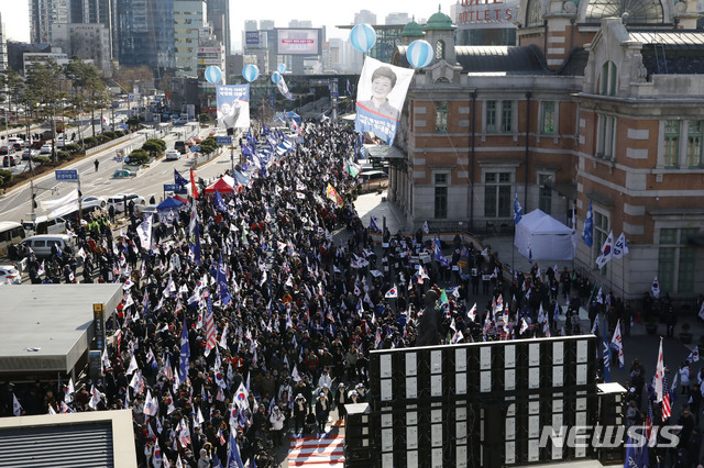 【서울=뉴시스】최동준 기자 = 8일 서울 용산구 서울역 앞에서 열린 태극기 집회에서 박근혜 전 대통령 지지자들이 박 전 대통령 석방을 촉구하고 있다. 2018.12.08.
