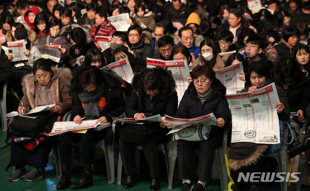 【서울=뉴시스】김선웅 기자 = 8일 서울 송파구 잠실학생체육관에서 열린 진학사 2019학년도 정시 합격전략 설명회에서 참가 학부모 및 학생들이 입시 설명을 듣고 있다. 2018.12.08.