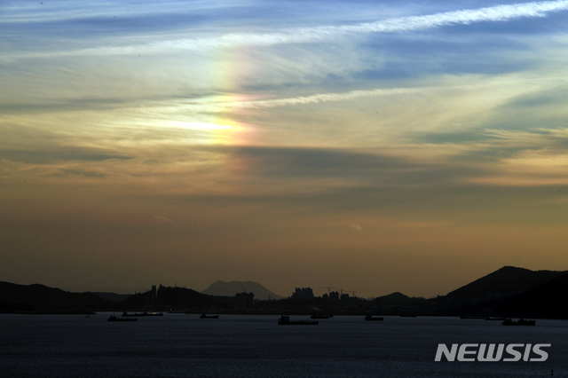 【남해=뉴시스】차용현 기자 = 올겨울 들어 가장 추운날씨를 보이고 있는 8일 오후 경남 남해군 서상항에서 바라본 하늘에 채운(무지개구름)이 관측되고 있다.