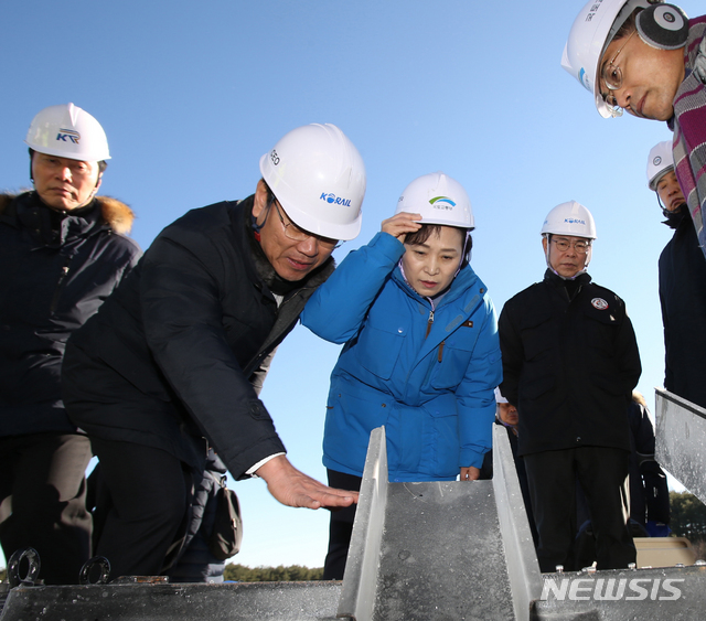 【강릉=뉴시스】김경목 기자 = 9일 오후 김현미 국토교통부 장관이 전날 오전 7시33분에 고속열차 탈선 사고가 발생한 강원도 강릉시 운산동 사고 현장에서 탈선의 원인으로 추정되고 있는 선로전환기를 살펴보고 있다. 오영식 코레일 사장(왼쪽)이 김 장관에게 선로전환기를 설명하고 있다. 2018.12.09.