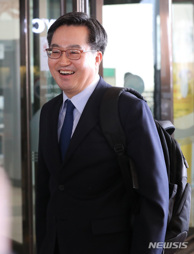 【세종=뉴시스】강종민 기자 = 김동연 부총리 겸 기획재정부 장관이 10일 오전 직원들과 인사를 나눈 뒤 가방을 메고 정부세종청사를 나서고 있다. 2018.12.10. [email protected]