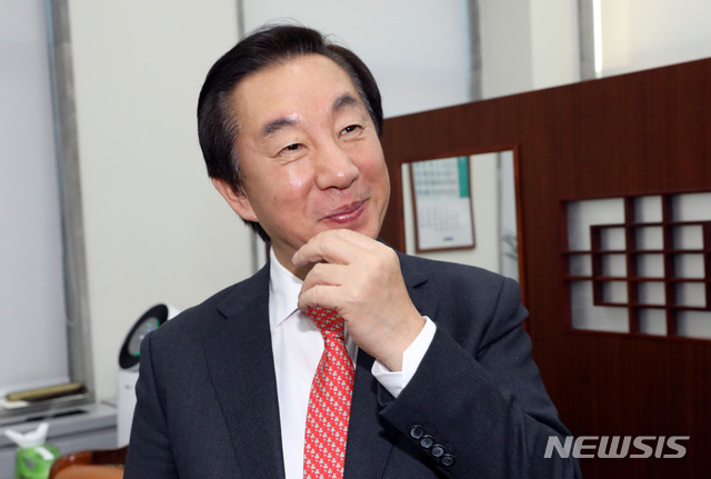 【서울=뉴시스】박영태 기자 = 10일 오후 서울 영등포구 여의도 국회 본청 자유한국당 원내대표실에서 열린 김성태 원내대표 임기 마무리 소회 기자간담회 전 김 원내대표가 밝게 웃고 있다. 2018.12.10.