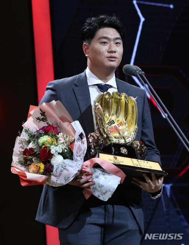 【서울=뉴시스】이영환 기자 = 10일 오후 서울 강남구 코엑스 오디토리움에서 열린 2018 KBO 골든글러브 시상식에서 골든글러브 투수 부문을 수상한 두산 린드블럼을 대신해 상을 수상한 이영하가 소감을 전하고 있다. 2018.12.10.