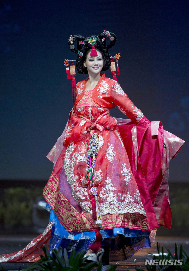 【촌부리=AP/뉴시스】10일(현지시간) 태국 촌부리에서 열린 미스 유니버스 국가의상 쇼에 참여한 미스퀸 코리아 백지현이 한복을 선보이고 있다.