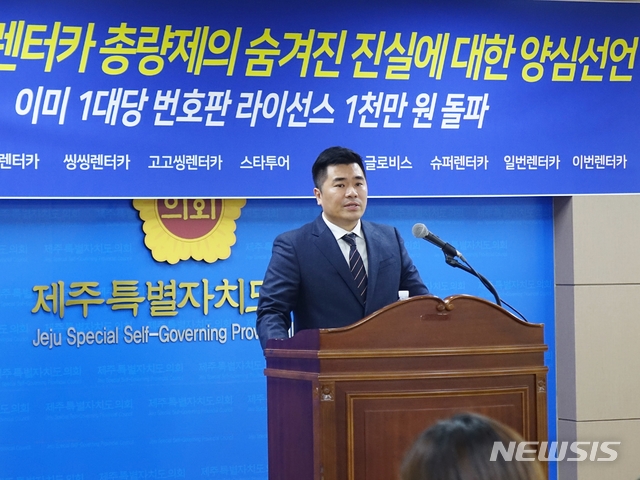 【제주=뉴시스】조수진 기자 = 문원식 ㈜제주스타렌터카 총괄 본부장이 11일 오후 제주도의회 도민의 방에서 기자회견을 열어 “제주특별자치도가 시행하는 렌터카 총량제에 따른 자율 감차 추진에 적극 동의하며 다른 렌터카 업체들도 동참해야 한다”고 밝히고 있다. 2018.12.11.