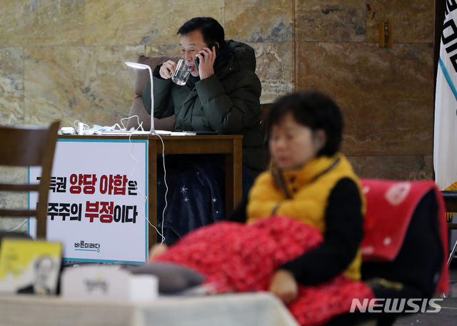 【서울=뉴시스】김병문 수습기자 = 정의당 이정미 대표와 바른미래당 손학규 대표가 11일 오전 서울 여의도 국회 본청 로텐더홀에서 더불어민주당과 자유한국당이 선거제 개편 수용 없이 2019년 예산안을 합의한 것에 반발해 6일째 단식을 이어가고 있다. 2018.12.11.