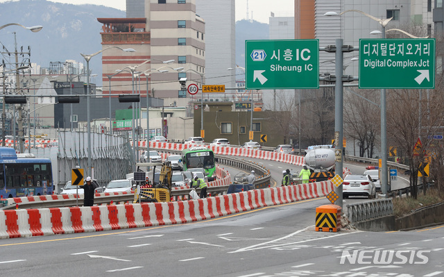 【서울=뉴시스】이영환 기자 = 11일 오전 서울 금천구 구로고가차도에서 차선을 통제하며 철거작업이 진행되고 있다.