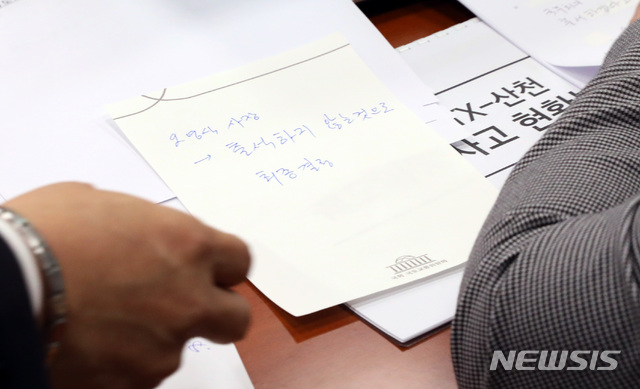 【서울=뉴시스】박영태 기자 = 11일 오전 서울 여의도 국회에서 강릉선 KTX철도사고 등 현안보고를 안건으로 열린 국회 국토교통위원회 전체회의에서 국토위 전문위원이 박순자 위원장에게 오영식 코레일 사장이 출석하지 않는 것으로 최종결정 됐다는 쪽지를 전달하고 있다. 2018.12.11.