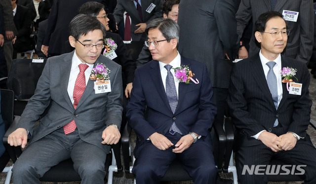【고양=뉴시스】홍효식 기자 = 김명수(가운데) 대법원장이 11일 오후 경기 고양식 일산동구 법원도서관 사무동 다목적실에서 열린 법원도서관 이전 개관식에서 권순일 대법관과 대화를 나누고 있다. 오른쪽은 조재연 대법관. 2018.12.11.