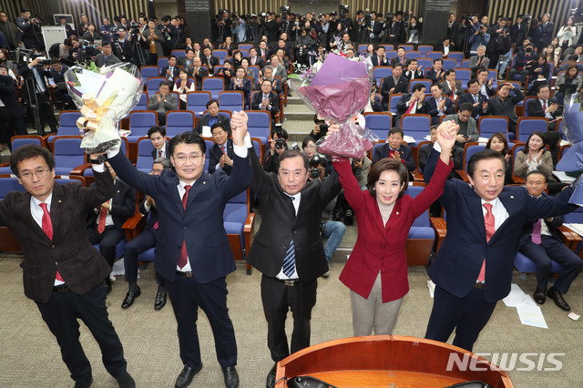 【서울=뉴시스】고승민 기자 = 자유한국당 신임 원내대표와 정책위의장으로 선출된 나경원 의원과 정용기 의원이 11일 오후 서울 여의도 국회에서 열린 2018년 원내대표 및 정책위의장 선출을 위한 의원총회에서 당선 확정 후 김병준 비상대책위원장과 손을 맞잡아 들고 있다.