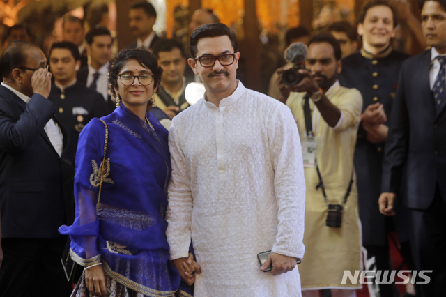 【뭄바이=AP/뉴시스】12일(현지시간) 아시아 최고 부자인 인도 릴라이언스 그룹의 무케시 암바니(61) 회장 딸 이샤 암바니(27)의 결혼식이 뭄바이 무케시 회장의 저택에서 열린 가운데 발리우드 스타 아미르 칸(오른쪽)과 부인 키란 라오가 하객으로 참석하고 있다.