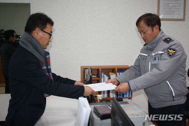 【태백=뉴시스】김태식 기자 = 13일 강원 태백시지역현안대책위원장 선거가 과열양상을 보이고 있는 가운데 위원장 입후보 등록이 반려된 박무봉씨가 태백경찰서에 권리행사 방해와 명예훼손을 당했다며 김호규 현 위원장과 선거관리위원 4명에 대한 고소장을 접수하고 있다.2018.12.13.
