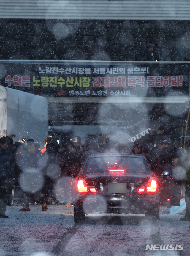 【서울=뉴시스】이윤청 수습기자 = 수협중앙회의 구시장에 대한 명도집행이 예고된 13일 오전 서울 동작구 구 노량진수산시장에서 수협 관계자들과 구시장 상인들이 충돌, 수협 관계자가 구시장 상인의 차량을 막고 있다.