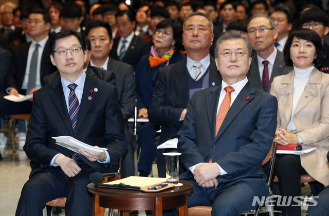 홍종학 장관 발표 듣는 문재인 대통령과 김경수 지사