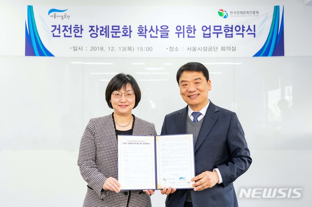 【서울=뉴시스】서울시설공단 이지윤 이사장과 한국장례문화진흥원 고경석 이사장이 13일 서울 성동구 마장동 서울시설공단 청사에서 건전한 장례문화 확산을 위한 업무협약을 체결한 뒤 기념촬영을 하고 있다. 2018.12.13. (사진=서울시설공단 제공)