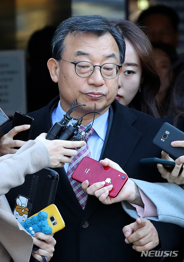 【서울=뉴시스】김선웅 기자 = 박근혜 정부 청와대 홍보수석 시절 KBS의 세월호 보도에 개입한 혐의로 재판에 넘겨진 이정현 국회의원(무소속)이 14일 오후 서울 서초구 서울중앙지법에서 열린 1심 선고공판에서 징역 1년, 집행유예 2년을 선고받은 후 법원을 나서고 있다. 2018.12.14.