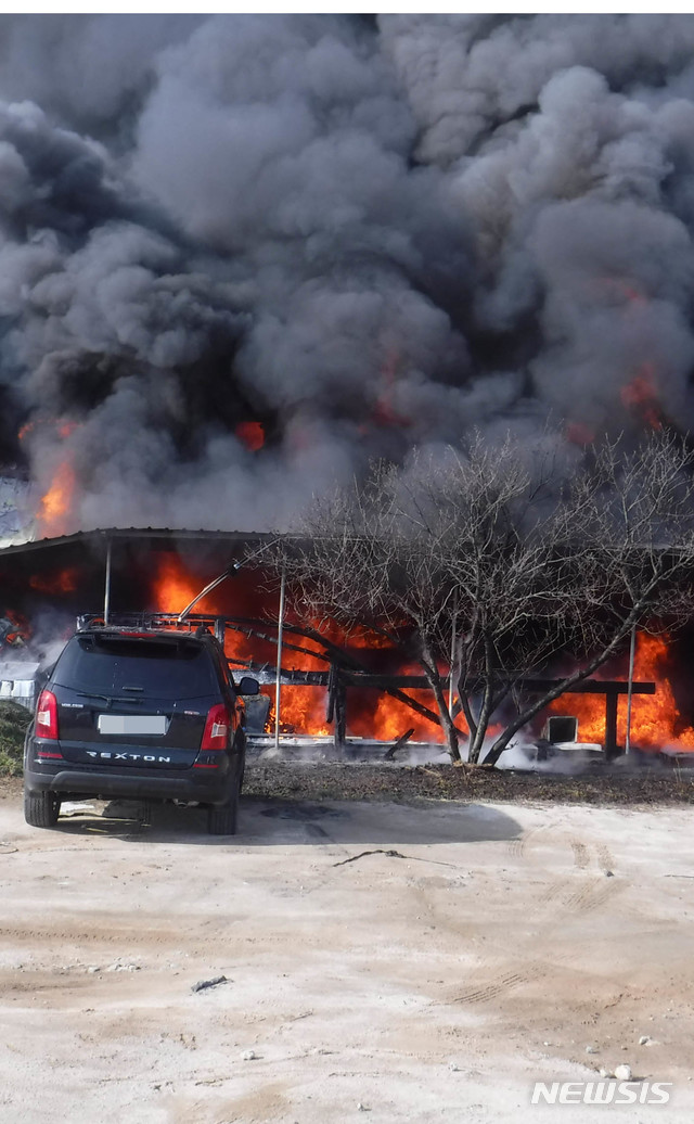 【예산=뉴시스】함형서 기자 = 15일 오전 11시 44분께 충남 예산군 덕산면 수덕사 입구 상가에서 불이 났다. 이날 불은 점포 4개 1024㎡를 태우고 출동한 119 소방대원들에 의해 1시간 20여분 만에 진화됐다. 다행히  인명피해는 없었다. 경찰과 소방당국은 정확한 화재원인을 조사하고 있다. (사진=예산소방서 제공)