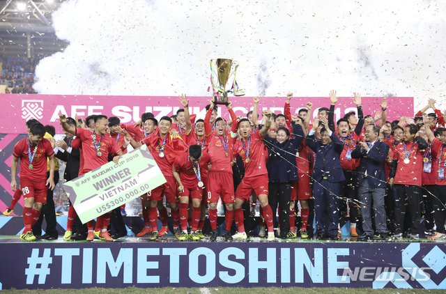 【하노이=AP/뉴시스】15일(현지시간) 베트남 하노이 마이딘 스타디움에서 열린 2018 아세안축구연맹(AFF) 스즈키컵 결승전에서 말레이시아를 꺾고 우승을 차지한 베트남 축구대표팀이 우승컵을 들고 환호하고 있다.