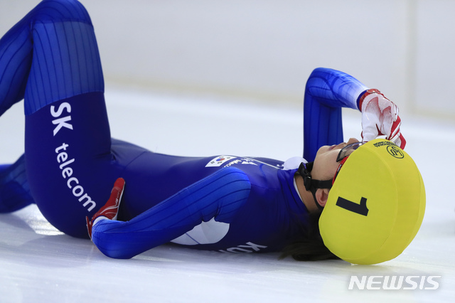 【헤렌벤=AP/뉴시스】스피드스케이팅 김보름이 15일(현지시간) 네덜란드 헤렌벤의 티알프 아이스 아레나에서 열린 국제빙상경기연맹(ISU) 스피드스케이팅 월드컵 4차 대회 매스 스타트 여자부 결승 마지막 코너에서 캐나다 이바니 블론딘의 손에 걸려 넘어져 고통스러워하고 있다.