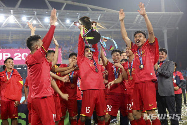 【하노이=AP/뉴시스】15일(현지시간) 베트남 하노이 마이딘 스타디움에서 열린 2018 아세안축구연맹(AFF) 스즈키컵 결승전 최종 2차전에서 말레이시아를 꺾은 베트남 축구대표단(감독 박항서)이 우승컵을 들어 올리며 자축하고 있다.