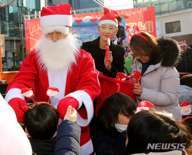 【서울=뉴시스】지난 15일 오후 서울시 서대문구 포방터시장에서 열린 '우리 동네 시장 나들이'에서 산타 복장을 한 문석진(왼쪽) 서대문구청장이 어린이들에게 루돌프 머리띠를 씌워주고 있다. 2018.12.16. (사진=서대문구청 제공)