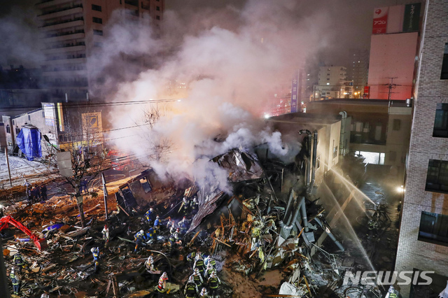 【삿포로=AP/뉴시스】16일 저녁 일본 홋카이도 삿포로의 한 주점이 폭발해 현장에 출동한 소방관과 구조대가 작업하고 있다.