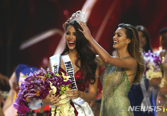 【방콕=AP/뉴시스】17일(현지시간) 태국 방콕에서 열린 제67회 미스 유니버스 선발대회에서 영예의 1위를 차지한 미스 필리핀 카트리오나 그레이(왼쪽)가 지난해 미스 유니버스 데미리 넬피터스(남아공)로부터 왕관을 받고 있다.