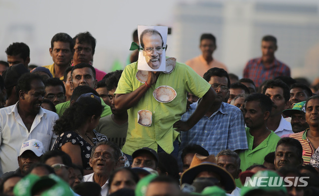 【콜롬보=AP/뉴시스】17일(현지시간) 스리랑카 수도 콜롬보에서 라닐 위크레메싱게 스리랑카 총리를 지지하는 한 남성이 마이트리팔라 시리세나 대통령의 옷을 입고 시위에 참가하고 있다.