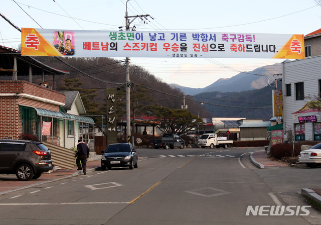 【산청=뉴시스】정경규 기자 = 18일 오전 경남 산청군 생초면 박항서 베트남 축구대표팀 감독 고향 마을 입구에 생초면민들이 내건 스즈키컵 우승 축하 플래카드가 펄럭이고 있다.2018.12.18.