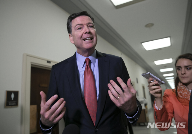 【워싱턴DC=AP/뉴시스】제임스 코미 전 미국 연방수사국(FBI) 국장이 17일(현지시간) 하원 법제사법위원회와 정부개혁감독위원회 비공개 인터뷰를 마치고 기자들에게 발언하고 있다.