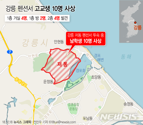 【서울=뉴시스】18일 오후 강원 강릉시 저동의 한 펜션에서 고교생 10명이 단체 숙박 중 3명이 사망하고 7명이 의식불명되는 사고가 발생했다.(그래픽=전진우 기자)
