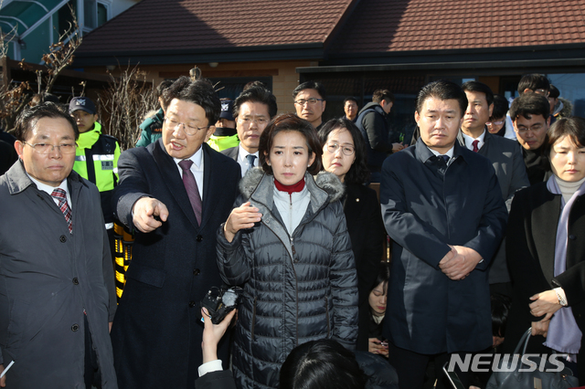 【강릉=뉴시스】김경목 기자 = 나경원 자유한국당 원내대표와 권성동 의원 등 한국당 관계자들이 강릉 펜션 참사 이틀째인 19일 오후 강원 강릉시 저동 펜션 사건 현장을 방문해 수사 진행 상황 등을 점검하고 있다. 2018.12.19.