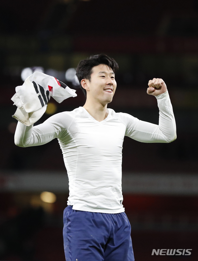 【런던=AP/뉴시스】토트넘의 손흥민이 19일(현지시간) 런던 에미레이트 스타디움에서 열린 2018-2019 카라바오컵(잉글랜드 리그컵) 아스널과의 8강전을 마치고 태극기를 들고 기뻐하고 있다.