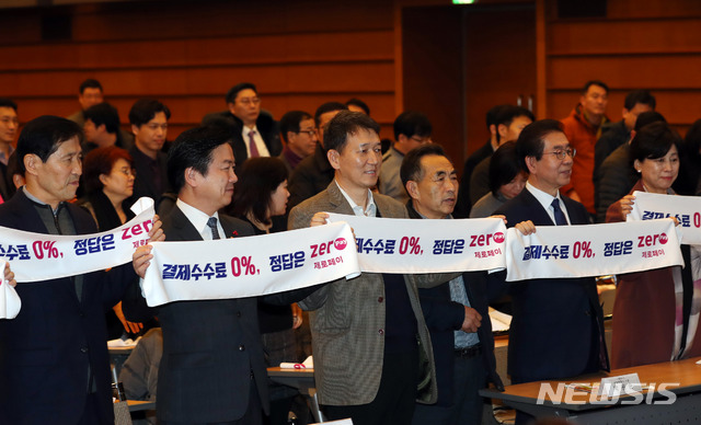 【서울=뉴시스】조성봉 기자 = 홍종학(왼쪽 두번째) 중소벤처기업부 장관과 박원순(오른쪽 두번째) 서울시장을 비롯한 소상공인들이 20일 오전 서울 중구 대한상공회의소 국제회의장에서 열린 제로페이 이용확산 결의대회에서 '결제 수수료 0%, 정답은 제로페이' 펼침막을 들고 제로페이 이용 확산을 외치고 있다.