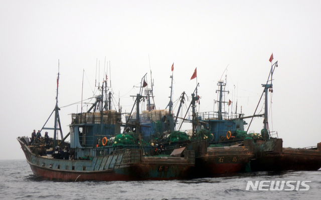 【목포=뉴시스】박상수 기자 = 19일 오전 전남 신안군 가거도 북서방 94㎞ 해상에서 무허가 조업혐의로 나포한 중국어선을 탈취해 도주한 중국선단 어선 3척이 나포돼 집단으로 결박돼 있다. 2018.12.20. (사진=서해어업관리단 제공)