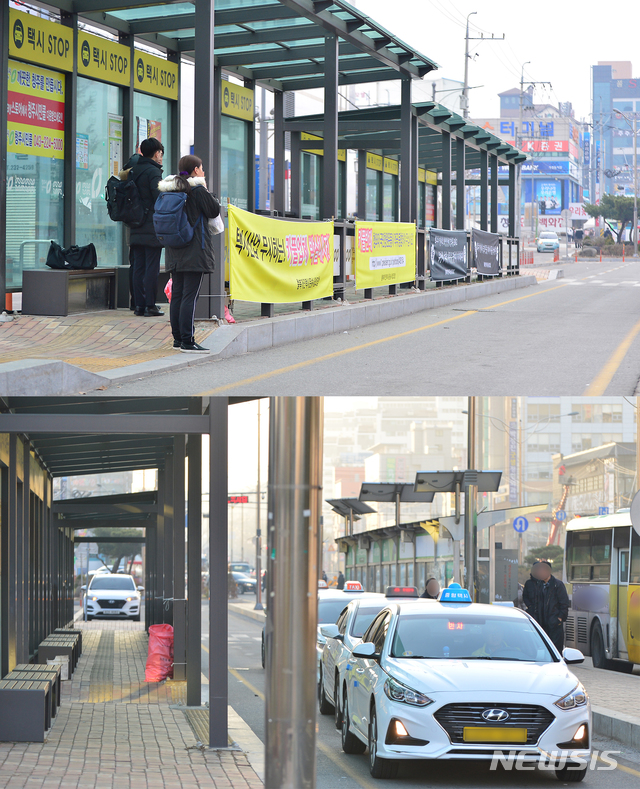 【청주=뉴시스】인진연 기자 = '카카오 카풀' 서비스를 반대하는 대규모 집회로 택시 운행이 중단된 지난 20일 충북 청주시 고속버스터미널 택시승강장에서 시민들이 택시를 기다린 것과 반대로 21일 같은 시각 택시승강장은 길게 줄선 택시들이 손님을 기다리고 있다. 2018.12.21.