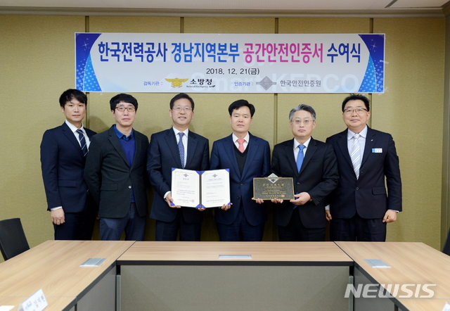 【창원=뉴시스】강경국 기자 = 21일 한국전력공사 경남지역본부 회의실에서 김지현 기획관리실장, 김창영 한국안전인증원 이사장, 이기오 창원소방서장이 한국안전인증원의 공간안전인증서를 전달한 후 기념촬영을 하고 있다. 2018.12.21. (사진=한국전력공사 경남지역본부 제공)